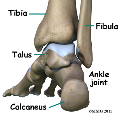 The ankle joint is formed by the connection of three bones. The top of the talus fits inside a socket that is formed by the lower end of the tibia (shinbone) and the fibula (the small bone of the lower leg). The bottom of the talus sits on the heel bone, called the calcaneus.