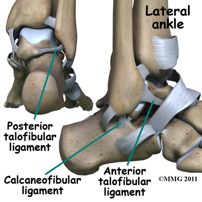 Ligaments are tough bands of tissue that connect bones together. Three ligaments make up the lateral ligament complex on the side of the ankle farthest from the other ankle. They are the anterior talofibular ligament (ATFL), the calcaneofibular ligament (CFL), and the posterior talofibular ligament (PTFL).