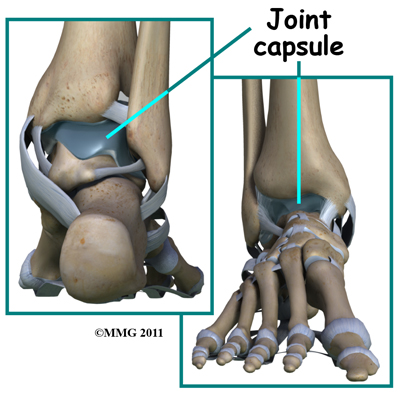 A watertight pocket called the joint capsule surrounds the ankle joint. Ligaments, connective tissue and synovial tissue form this capsule. When the joint capsule is filled with sterile saline and is distended, the surgeon can insert the arthroscope into the pocket that is formed, turn on the lights and the camera and see inside the ankle joint as if looking into an aquarium. The surgeon can see the structures that are inside the ankle joint including the joint surfaces of the distal tibia, fibula and talus and the synovial lining of the joint.