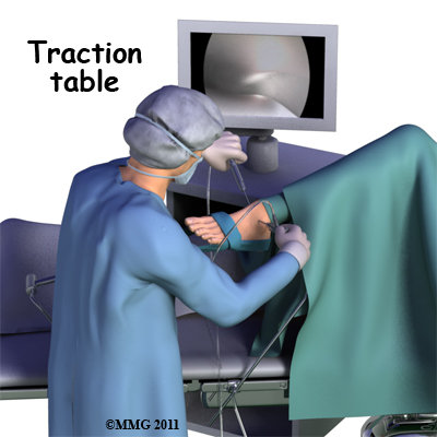 Before surgery you will be placed under either a general anesthesia or a type of spinal anesthesia. Sterile drapes are placed to create a sterile environment for your surgeon to work. There is a great deal of equipment that surrounds the operating table including the TV screens, cameras, light sources and surgical instruments. Your surgeon will apply traction to your ankle joint. The ankle joint is very tight with little space between the tibia and the talus so by applying traction, your surgeon is able to increase this space and allow the arthroscope to be inserted into that space. The end of the arthroscope will be moved about in this space to look throughout the joint.