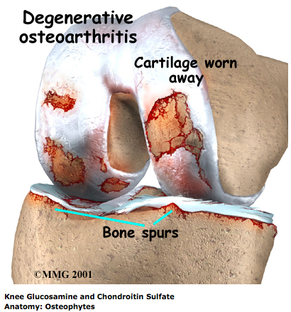 When the articular cartilage degenerates, or wears away, the bone underneath is uncovered and rubs against bone, which causes pain. Small outgrowths called bone spurs, or osteophytes, may form in the joint.