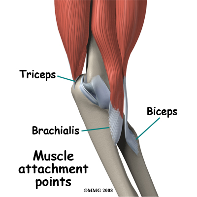 The muscles that cross the elbow joint also contribute to stability. These muscles either bend (flex) or straighten (extend) the elbow. Two powerful elbow flexor muscles attach at the elbow. The brachialis muscle attaches to the coronoid process of the ulna and the biceps attaches to tuberosity of the radius. The most powerful muscle of the arm is the triceps, which straightens the elbow. This muscle attaches to the olecranon process, which is the point at the back of the elbow. The pull of any of these muscles is strong enough occasionally to pull off a piece of their bony attachment. This type of injury is called an avulsion fracture.