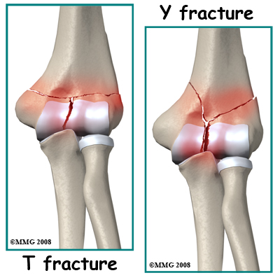 T or Y Fractures. The lower part of the humerus divides into two columns that support the joint. If you sustain a blow on the elbow, a common fracture pattern is for the columns to be broken and the fracture to extend into the trochlear region of the joint forming a T or Y pattern.