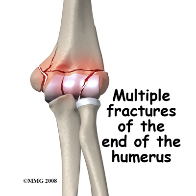 Smash Fracture. More severe forces on the elbow may cause multiple fractures to the end of the humerus. The joint surface may be in many pieces and some of the bone fragments may lose their blood supply. This is a difficult situation to manage but the best results come from an ORIF surgery, restoring the joint surface, and fixing it rigidly to allow early movement of the joint.