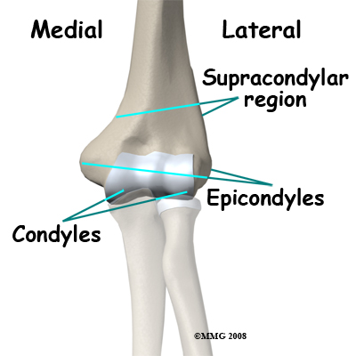 Avulsion of the medial epicondyle: The medial epicondyle is the origin site of the strong medial collateral ligament of the elbow and the flexor muscles of the forearm. A force that bends the elbow outwards may dislocate it and disrupt the ligaments on the inner side of the elbow. This may result in an avulsion (pull-off) fracture of the medial epicondyle. The medial collateral ligament pulls off a fragment of the bone.