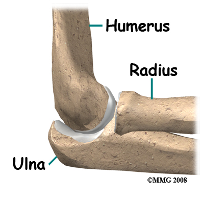 The elbow itself is essentially a hinge joint, meaning it bends and straightens like a hinge. But there is a second joint where the end of the radius (the radial head) meets the humerus. This joint is complicated because the radius has to rotate so that you can turn your hand palm up and palm down. At the same time, it has to slide against the end of the humerus as the elbow bends and straightens.