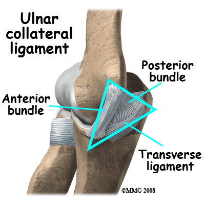 In the elbow, two of the most important ligaments are the ulnar collateral ligament (UCL) and the lateral collateral ligament. The UCL is also known as the medial collateral ligament. The ulnar collateral ligament is on the medial (the side of the elbow that\'s next to the body) side of the elbow, and the lateral collateral is on the outside. The ulnar collateral ligament is a thick band of ligamentous tissue that forms a triangular shape along the medial elbow. It has an anterior bundle, posterior bundle, and a thinner, transverse ligament.