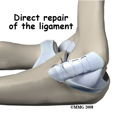 If the ulnar collateral ligament has been injured acutely due to a fall on the outstretched arm, a direct repair of the ligament may be possible. If the ligament has pulled off the bone, it may be reattached with sutures through holes drilled in the bone. If the ligament is damaged by constant overuse and is not strong enough to restore stability to the elbow joint if it is simply re-attached or repaired, then the ligament must be replaced with a new ligament. This is termed a ligament reconstruction. During a reconstruction, the ulnar collateral ligament along the medial (inside) of the elbow is replaced with a tendon graft harvested from somewhere else in the body (autograft). One common technique used to replace the damaged ulnar collateral ligament is called the technique.