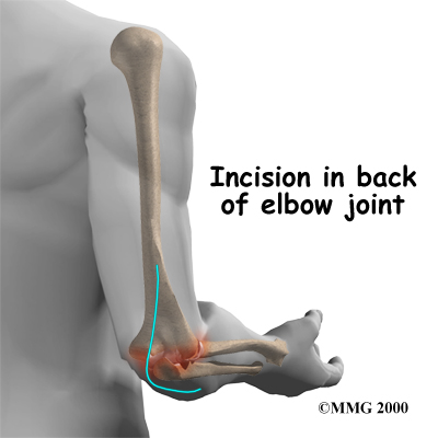 The first step in an elbow fusion is an down the back of the elbow. The incision is made on the back side because most of the blood vessels and nerves are on the inside of the elbow. Entering through the back of the elbow makes them less likely to be damaged.
