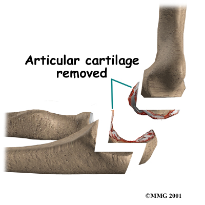 There are many different types of operations to fuse the elbow. Most of the procedures are designed to remove the articular cartilage from the joint surfaces of the hinge joint and then bind the two surfaces together until they heal. When two raw bone surfaces are held together like this, your body treats them like a broken bone. New bone forms to heal the two pieces together. When the fusion is healed, a strong, solid connection between the humerus and ulna will have replaced the painful arthritic joint.