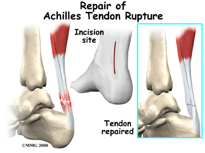 Surgery may also be suggested if you have a ruptured Achilles tendon. Reattaching the two ends of the tendon repairs the torn Achilles tendon. This procedure is usually done through an incision on the back of the ankle near the Achilles tendon. Numerous procedures have been developed to repair the tendon, but most involve sewing the two ends of the tendon together in some fashion. Some repair techniques have been developed to minimize the size of the incision.