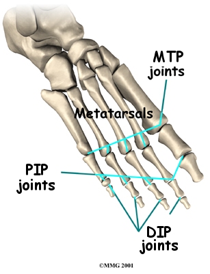The toe bones connect to form the toe joints. The metatarsophalangeal joint (or MTP joint) is the first joint that connects the toe to the foot. The ball of the foot is formed by the MTP joints. The second joint is the proximal interphalangeal joint (or PIP joint), and the last is the distal interphalangeal joint (or DIP joint). A joint capsule made of ligaments and connective tissue holds the bones together and surrounds each joint. Two tendons run along the bottom of each toe that allow us to curl our toes, and one tendon runs along the top that raises the toe.