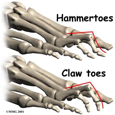 In a hammer toe deformity, the first joint (MTP) is cocked upward, and the middle joint (PIP) is bent downward. A claw toe deformity has a cocked up MTP joint, and both the middle joint (PIP) and the small joint at the end of the toe (the DIP) are curled downward like a claw.