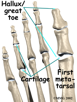 The big toe in medical terms is called the hallux. The joint at the base of the big toe is called the metatarsophalangeal, or MTP, joint. Like any other joint in the body, the joint is covered with articular cartilage, which is a slick, shiny covering on the end of the bone. If this cartilage is injured, it begins a slow process of wearing out, or degeneration. The articular surface can wear away so much that eventually raw bone rubs against raw bone.
