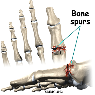 In some cases bone spurs that form on the top of the joint can bump together when the big toe bends upward, or extends. This causes a problem when walking because the big toe needs to bend upward when the foot is behind the body, in order to take the next step. The constant irritation when the bone spurs bump together leads to pain and difficulty walking.