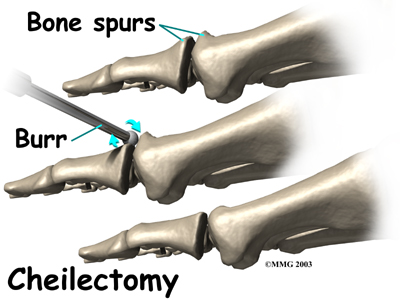 A cheilectomy is a procedure to remove the bone spurs at the top of the joint so that they don't bump together when the toe extends. This allows the toe to bend better and reduces the amount of pain while walking. To perform a cheilectomy, an incision is made along the top of the joint. The bone spurs that are blocking the joint from extending are identified and removed from both the bones that make up the joint. A little extra bone may be taken off to ensure that nothing rubs when the hallux is raised. The skin is closed and allowed to heal.