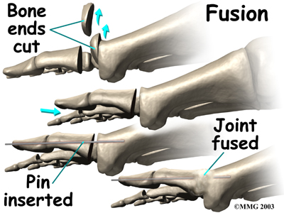 Many surgeons prefer arthrodesis, or fusion, of the MTP joint to relieve the pain. To fuse a joint means to encourage the two bones that form a joint to grow together and become one bone. To perform a fusion, an incision is made into the MTP joint. The joint surfaces are removed. The two surfaces are then fixed with either a metal pin or screw, with the toe turned slightly upward to allow for walking. The bones are then allowed to fuse. The fusion usually takes about three months to become solid.This results in a joint that no longer moves. Wearing a rocker-soled shoe is usually necessary following a fusion to improve your gait.