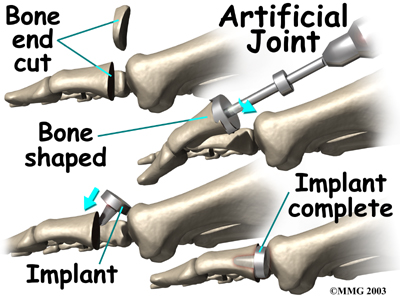 To perform an artificial joint replacement, an incision is first made on the top of the big toe over the MTP joint. Once the joint is surgically entered, the arthritic joint surface of the proximal phalanx (the first bone of the big toe) is removed. The hollow marrow area of the proximal phalanx is prepared with special instruments so that the artificial joint surface will fit snugly into the bone. Different sized implants are tried, and the toe is moved through a range of motion to help determine if the fit is proper.
