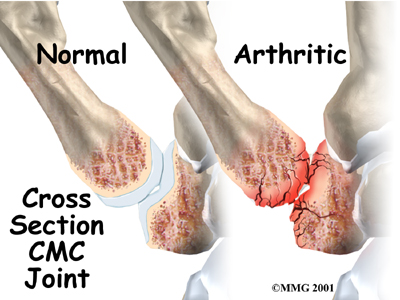 Injury to a joint, such as a bad sprain or fracture, can cause damage to the articular cartilage. An injury to the CMC joint of the thumb, even if it does not injure the articular cartilage directly, can alter how the joint works. After a fracture of the thumb metacarpal, the bone fragments may heal in slightly different positions. The joints may then line up differently. This is also true when the ligaments around the CMC joint are damaged by a sprain. When an injury results in a change in the way the joint moves, the injury may increase the forces on the articular cartilage surfaces. This is similar to any mechanical device or machinery. If the mechanism is out of balance, it tends to wear out faster.
