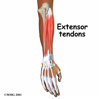 The begin as muscles that arise from the backside of the forearm bones. These muscles travel towards the hand, where they eventually connect to the extensor tendons before crossing over the back of the wrist joint. As they travel into the fingers, the extensor tendons become the extensor hood. The extensor hood flattens out to cover the top of the finger and sends out branches on each side that connect to the bones in the middle and end of the finger. When the extensor muscle contracts, it shortens and pulls on these attachments to straighten the finger.