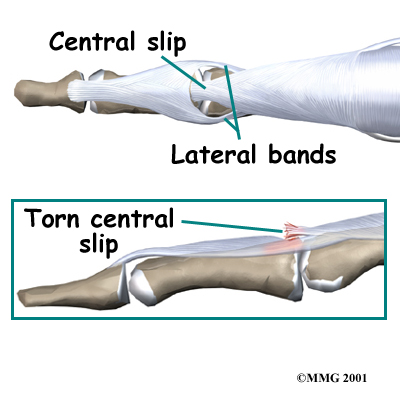 When a small amount of bone is pulled off with the tendon, doctors call it an avulsion fracture. The central slip can also be torn when the PIP joint is dislocated and the towards the palm.
