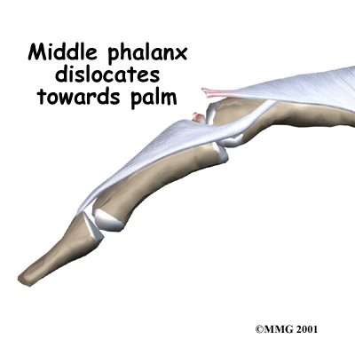 When the deformity is the result of a dislocation of the PIP joint, surgery may be required to repair the damaged structures and prevent the later development of a boutonniere deformity. A is usually placed through the PIP joint to fix the joint in place for up to three weeks. Patients wear a splint to protect the joint for another three weeks after surgery.