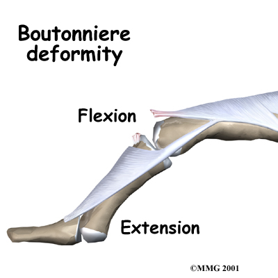 A boutonniere deformity occurs when disease or injury causes the PIP joint to become flexed (bent) and the DIP joint is pulled up into too much extension (hyperextension).