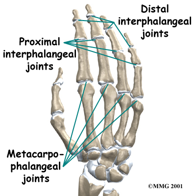The work like hinges when the fingers bend and straighten. The main knuckle joint is the metacarpophalangeal joint (MCP joint). It is formed by the connection of the metacarpal bone in the palm of the hand with the finger bone, or phalange. Each finger has three phalanges, separated by two interphalangeal joints (IP joints). The one closest to the MCP joint (knuckle) is called the proximal IP joint (PIP joint). The joint near the end of the finger is called the distal IP joint (DIP joint).