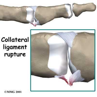 Injury to the collateral ligaments can occur when the joint is forced to bend too far sideways until one of the . These ligaments can also be injured if the PIP joint is actually dislocated, with the middle phalanx dislocating behind the proximal phalanx.