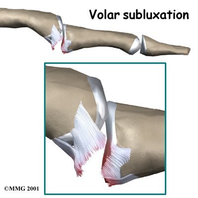 Injury to the volar plate can occur when the joint is hyperextended. If a occurs, the ligament usually ruptures or tears from its attachment on the middle phalanx.