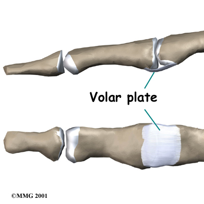The ligament tightens as the joint is straightened and keeps the PIP joint from bending back too far (hyperextending). Swan neck deformity can occur when the volar plate loosens from disease or injury.