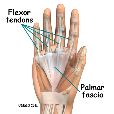The palmar fascia lies under the skin on the palm of the hands and fingers. This fascia is a thin sheet of connective tissue shaped somewhat like a triangle. It covers the tendons of the palm of the hand and holds them in place. It also prevents the fingers from bending too far backward when pressure is placed against the front of the fingers. The fascia separates into thin bands of tissue at the fingers. These bands continue into the fingers where they wrap around the joints and bones. Dupuytren's contracture forms when the palmar fascia begins to thicken and tighten, causing the fingers to bend.