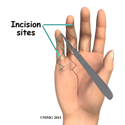 Once you have anesthesia, your surgeon will make sure the skin of your palm is free of infection by cleaning the skin with a germ-killing solution. An incision will be made in the skin. Several types of incisions can be made, but yours will most likely be made along the natural creases and lines in the hand. This will help make the scar less noticeable once the hand is healed.