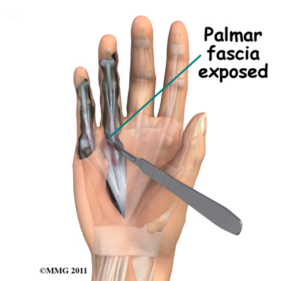Once the palmar fascia is exposed, it will be carefully separated from nerves, arteries, and tendons. Special care is taken not to damage the nearby nerves and blood vessels.