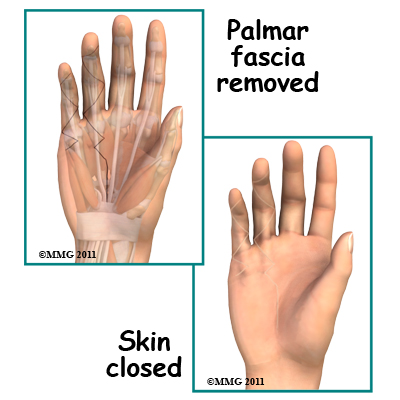 A skin graft may be needed if the skin surface has contracted so much that the finger cannot relax as it should and the palm cannot be stretched out flat. Surgeons graft skin from the wrist, elbow, or groin.