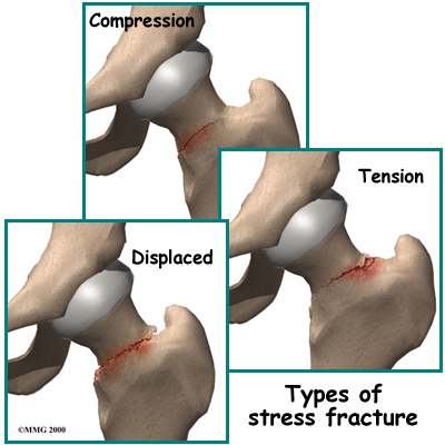 Surgeons put fatigue fractures of the femoral neck into . Compression fractures occur on the underside of the femoral neck. Tension fractures occur on the upper side of the bone and can cause more problems than fractures on the underside of the femoral neck. In displaced fractures, the bone cracks all the way through, and the two bones no longer line up correctly.