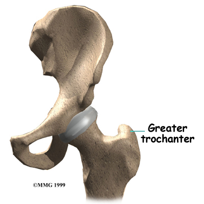 Stress fractures can also happen in the shaft of the femur bone, the , and the pelvis bone. The greater trochanter is a large bump below the neck of the femur. The buttock muscles that move the hip connect to this part of the femur.