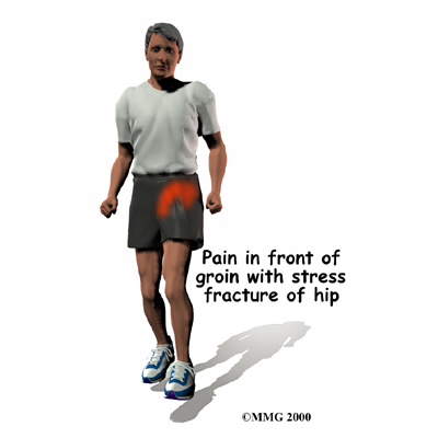 Most patients with stress fractures of the hip feel pain in the front of the groin while standing and moving. Rest usually makes the pain go away. Patients may limp. Strenuous activities, such as running and climbing stairs, may be so painful that the patient must stop doing them.