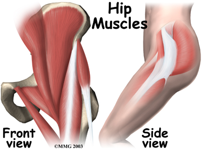 The hip itself is surrounded by the thick of the buttock on the back of the hip and the upper thigh muscles on the front.