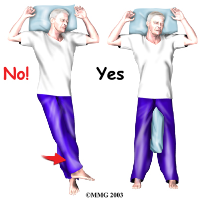- Don't turn your foot out. Place a next to your hip and leg to keep your leg from turning or rolling out while lying on your back in bed.