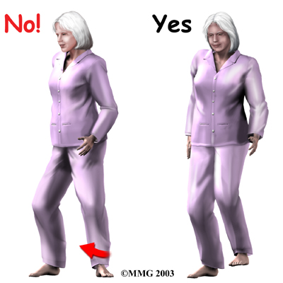 - Don't twist your body toward your operated hip. This means don't stand pigeon-toed. Keep the toes of your affected leg pointed forward when you stand, sit, or walk. If you turn your body in the direction of your surgical hip without pivoting your foot, your hip will be placed in an unsafe position. Remember to lift and turn your foot as you turn in the same direction as your surgical hip.