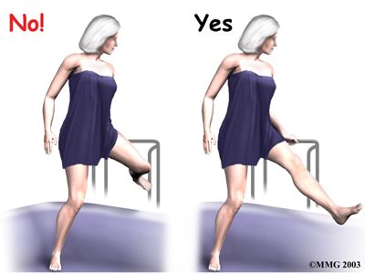 - Don't put your leg in a position, as though you are mounting a horse. This means preventing your leg from bending up and out when getting in or out of the bathtub. Instead, hold your leg, and lift it straight up and over the edge of the tub.