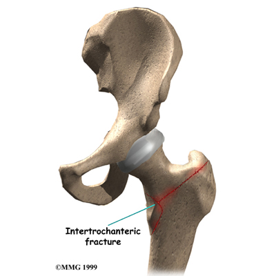 The intertrochanteric region of the hip is just below the femoral neck. A fracture in this area is called an . This type of fracture is most common when a person falls and fractures the hip. There is usually more than one fracture with more pieces of broken bone to be held together.