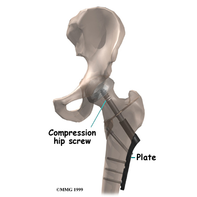 Fixing the hip fracture surgically with a special type of metal plate and screw, called a compression screw, does two things. First, it helps align the bone fragments and hold them in the proper position. Second, the fixation device is strong enough to keep the bones in place as you begin to move about. Before these devices were used, a patient needed to remain in bed usually with traction to hold the bones in alignment. The fixation now holds the bones in place while the bone heals. This allows you to get out of bed sooner because the metal plate and screw are strong enough to hold the bone fragments in place as you move.
