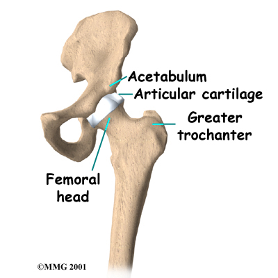 The surface of the femoral head and the inside of the acetabulum are covered with articular cartilage. This material is about one-quarter of an inch thick in most large joints. Articular cartilage is a tough, slick material that allows the surfaces to slide against one another without damage.