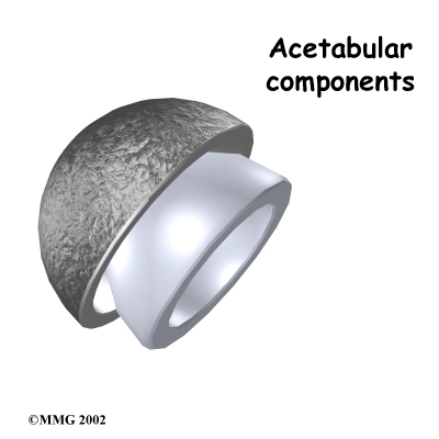 Each prosthesis is made of two main parts. The (socket) replaces the acetabulum. The acetabular component is made of a metal shell with a plastic inner liner that provides the bearing surface. The plastic used is very tough and slick, so tough and slick that you could ice skate on a sheet of the plastic without damaging it much.