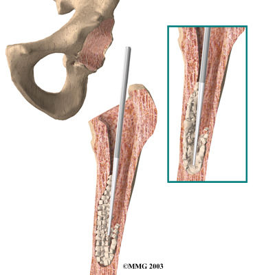 When the primary artificial joint has been put in using cement, the cement has to be removed from the socket of the hip as well as from the femoral canal (the bone marrow space in the thighbone).