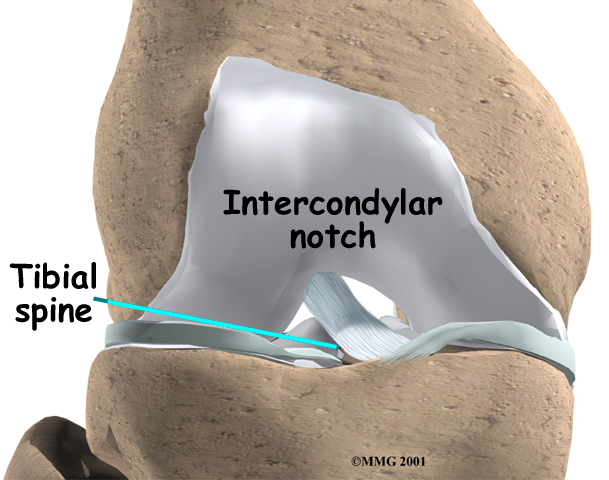 The ACL runs through a special notch in the femur called the intercondylar notch and attaches to a special area of the tibia called the .