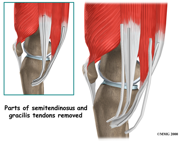 Surgeons also commonly use a hamstring graft to reconstruct a torn ACL. This graft is taken from one of the hamstring tendons that attaches to the tibia just below the knee joint. The hamstring muscles run down the back of the thigh. Their tendons cross the knee joint and connect on each side of the tibia. The graft used in ACL reconstruction is taken from the hamstring tendon, called the semitendinosus. This tendon runs along the inside part of the thigh and knee. Surgeons also commonly include as part of the a tendon just next to the semitendinousus, called the gracilis.