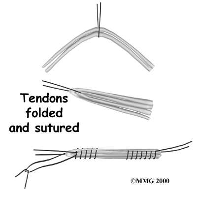 The tendons are arranged into three or four, which increases the strength of the graft. The surgeon stiches the strips together to hold them in place.